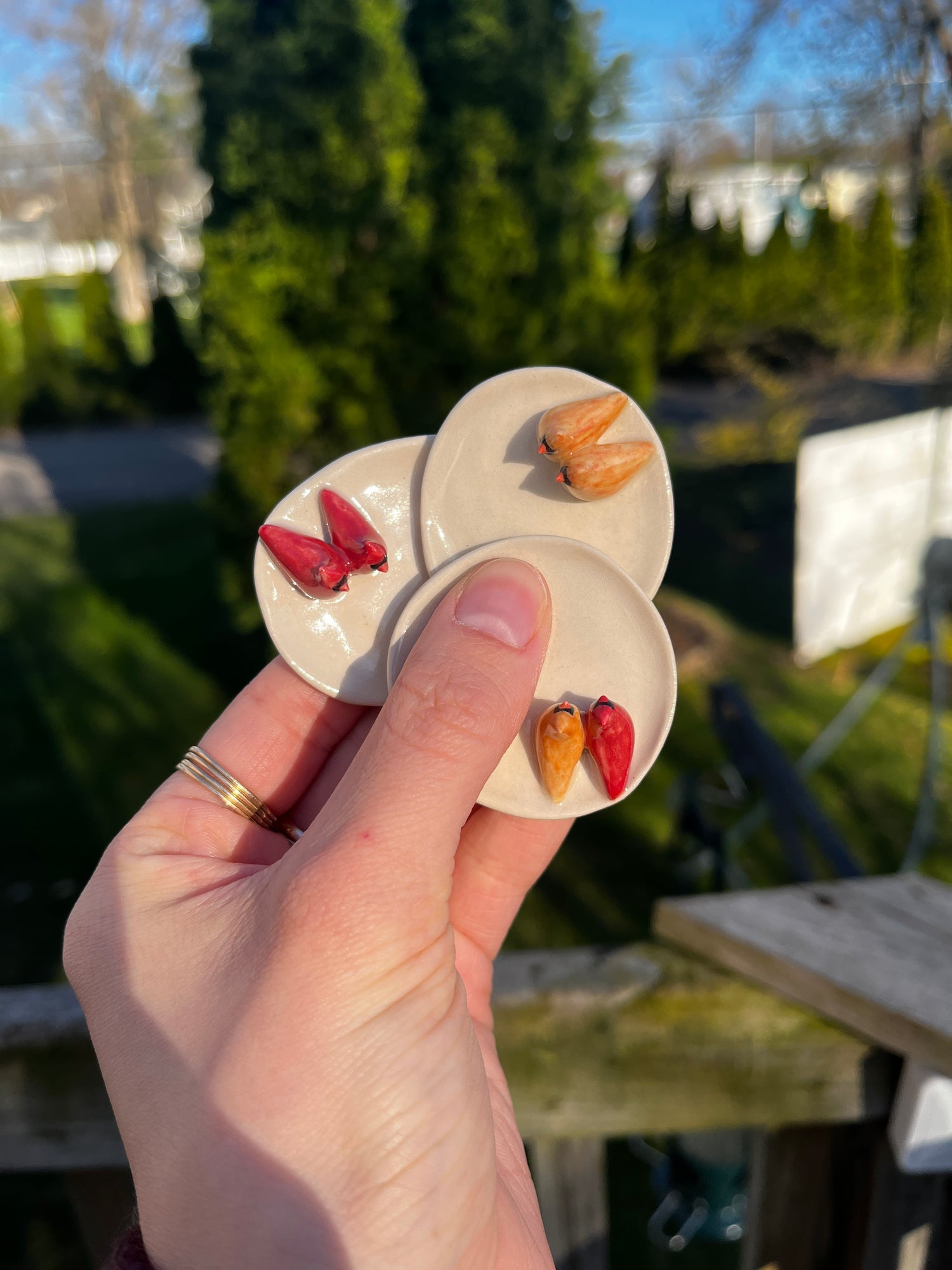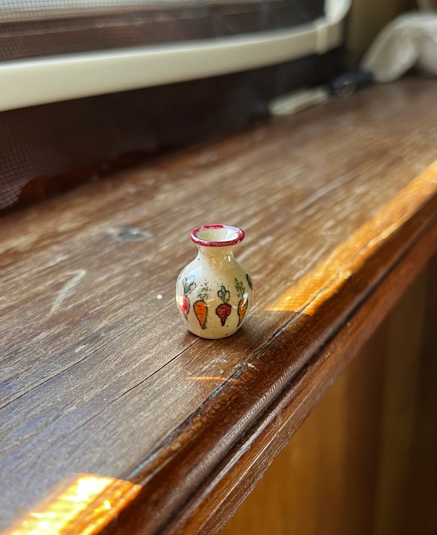 Thrown on a miniature wheel and adorned with hand painted tiny veggies.