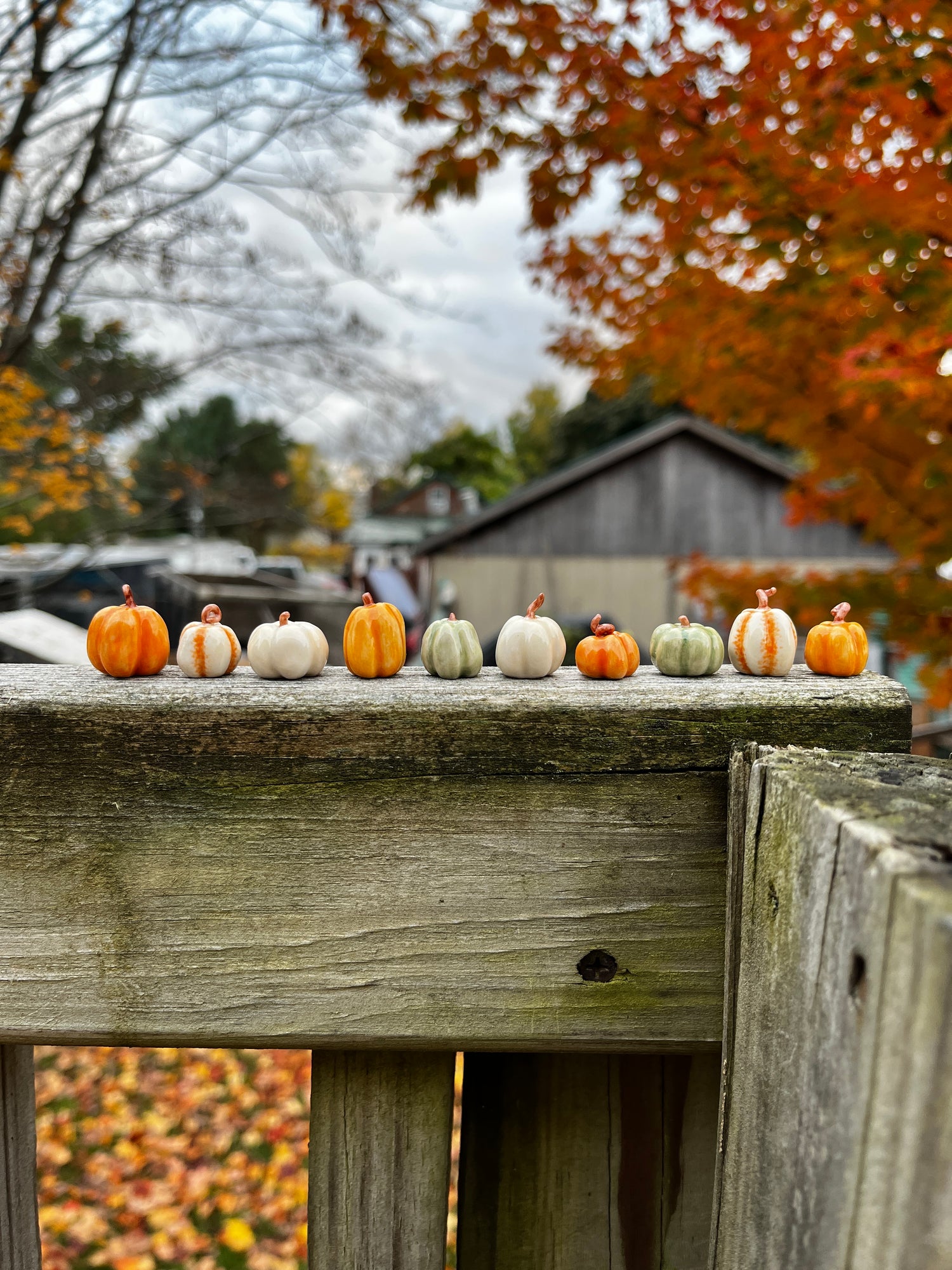 This pumpkin patch is one of a kind, composed of unique porcelain pumpkins.