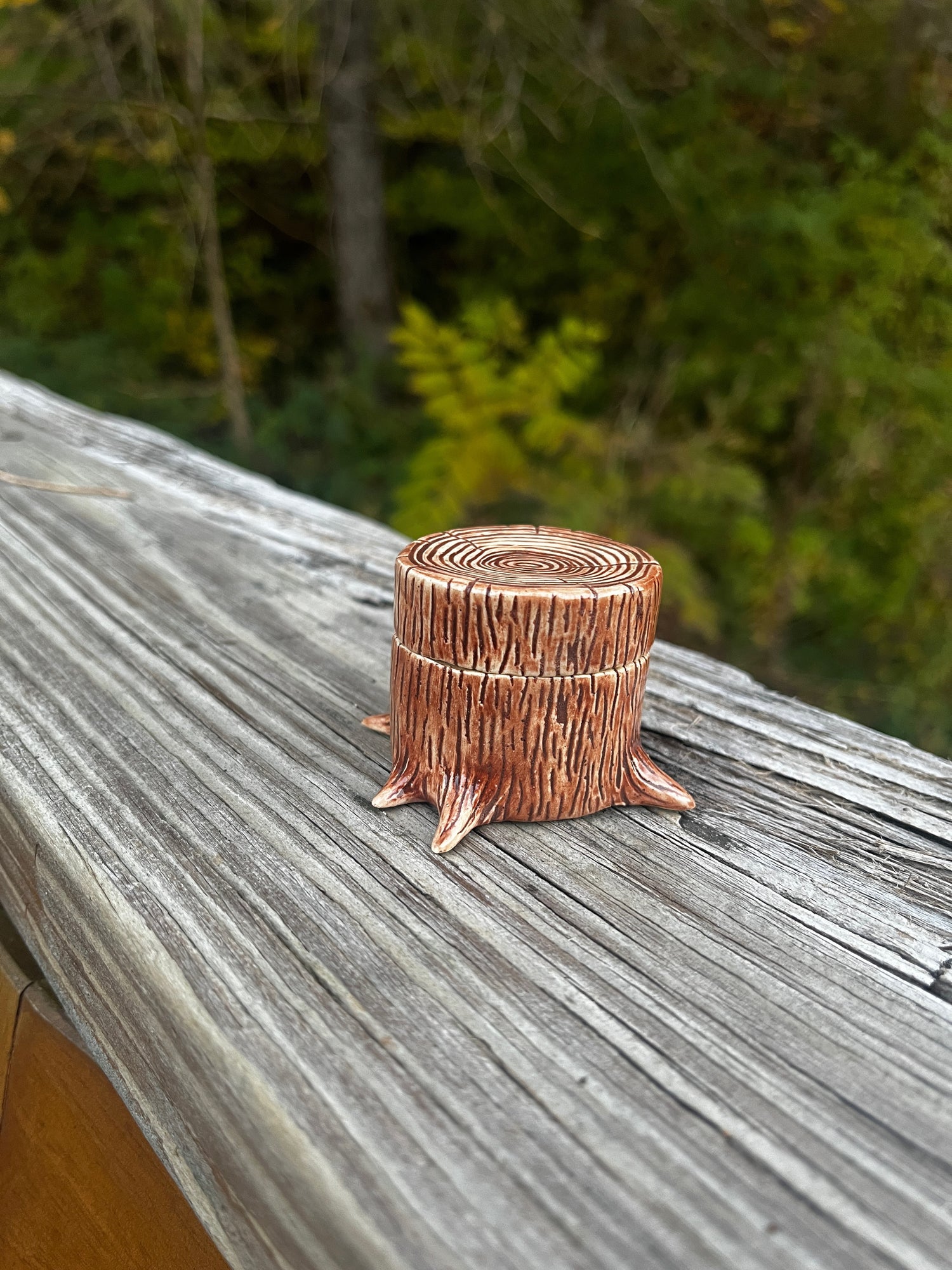 Originally made to hold wedding rings, this jar is the perfect little tree stump replica for your nightstand.