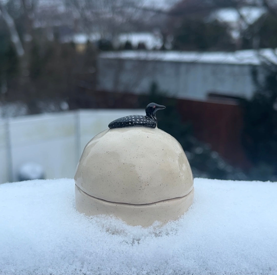 This little Loon Jar is adorned with a stunning black and white loon as well as little feet poking out on the inside.